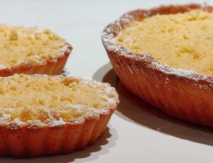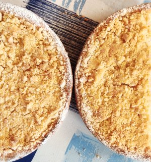 Ook deze klassieke puddingkruimeltaart kan niet ontbreken op een zondagmiddag.